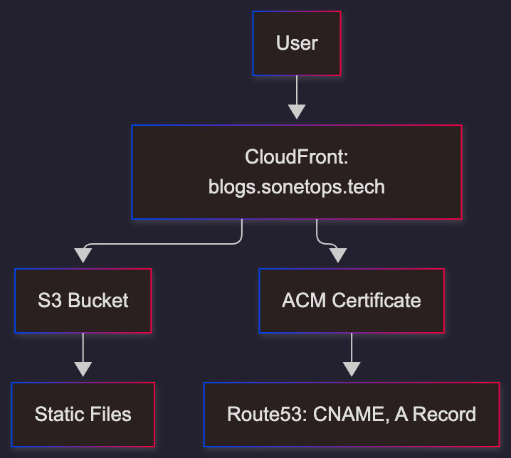 blogs.sonetops.tech> Alias to CloudFront (dxxxx.cloudfront.net).